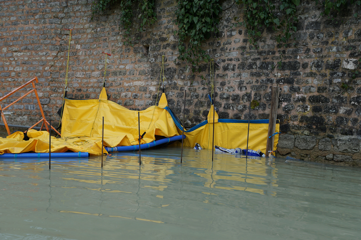 Assèchement localisé des douves pour reprise de fondations et rejointoiement du mur, avec batardeaux souples Water-Gate© en installation en U, pompage et appui sur échafaudage.