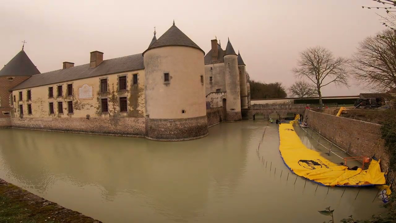 Mise en assec des douves du château de Chamerolles (Loiret) par batardeaux souples