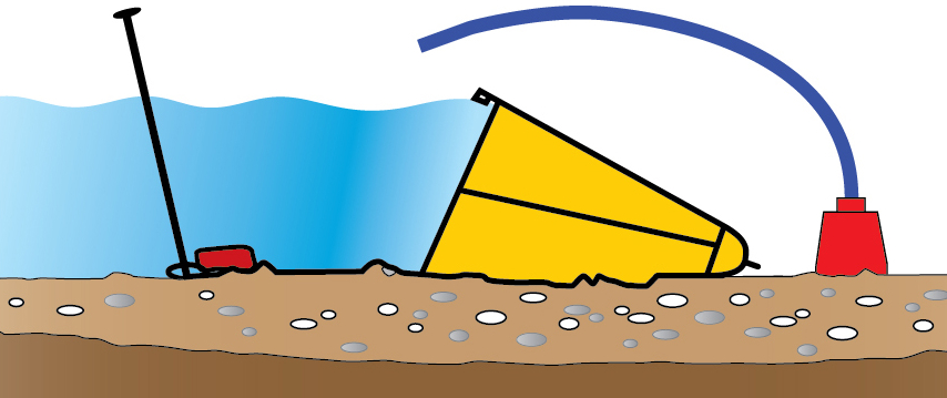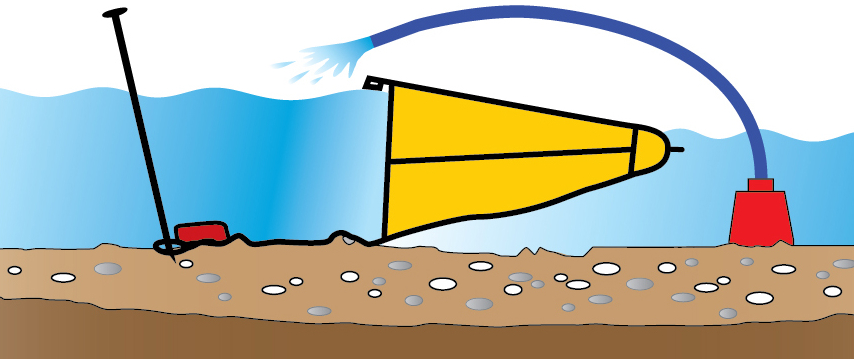 In calm water, the cofferdams are pre-positioned by anchoring the leading edge to the bottom of the water. Mooring is done using stakes placed in the metal rings on the leading edge to prevent movement of the canvas until the cofferdam is fully pressurized by pumping.